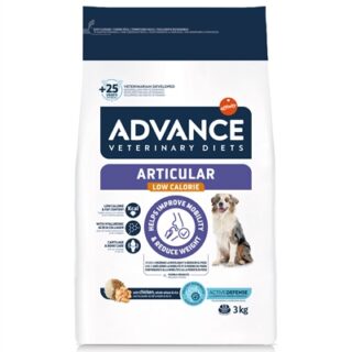 Advance Veterinary Diet Articular Gewrichten Minder Calorieën 12 kg is compleet en uitgebalanceerd hondenvoer voor volwassen honden (en puppy's vanaf 6 maanden), speciaal ontwikkeld voor honden met gewrichtsproblemen en overgewicht. Dit voer bevat probiotica, prebiotica, vezels en actieve immunoglobines, die bijdragen aan een gezonde darmflora, wat essentieel is voor een goede weerstand en heeft een verlaagd caloriegehalte.