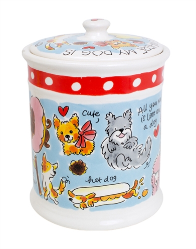 De Blond Amsterdam Voorraadpot Hond 16X16X22,5 cm is een aardewerken pot in Blond-stijl om de brokjes of snoepjes van jouw dier in op te bergen. Deze leuke voorraadpot vrolijkt gelijk de hele ruimte op! De aardewerken pot is uitgevoerd in de bekende Blond Amsterdam-stijl, met een vrolijke opdruk van diverse honden en leuke tekstjes. De voorraadpot is wit met een blauwe achtergrond en rode band. Ook op het deksel is een leuke opdruk geplaatst. De voorraadpot is magnetron en vaatwasser bestendig en mag niet ontbreken in elk dierenhuishouden!