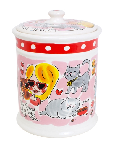 De Blond Amsterdam Voorraadpot Kat 16X16X22,5 cm is een aardewerken pot in Blond-stijl om de brokjes of snoepjes van jouw dier in op te bergen. Deze leuke voorraadpot vrolijkt gelijk de hele ruimte op! De aardewerken pot is uitgevoerd in de bekende Blond Amsterdam-stijl, met een vrolijke opdruk van diverse katten en leuke tekstjes. De voorraadpot is wit met een roze achtergrond en rode band. Ook op het deksel is een leuke opdruk geplaatst. De voorraadpot is magnetron en vaatwasser bestendig en mag niet ontbreken in elk dierenhuishouden!