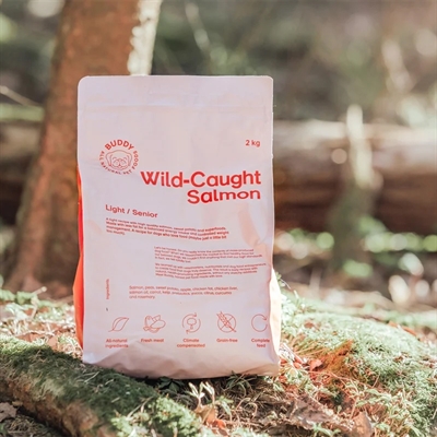 Buddy Wild Caught Salmon 2 kg is een smakelijke en complete hondenvoeding voor volwassen honden met een laag activiteitsniveau. Met 55% dierlijke ingrediënten en 45% groente, fruit en superfoods, biedt deze graanvrije voeding de eiwitten en voedingsstoffen die jouw hond verdient. De voeding is zeer geschikt voor oudere honden en honden met overgewicht. Dankzij de lagere hoeveelheid vet draagt dit recept bij aan een gebalanceerde energie-inname en helpt het bij gecontroleerde gewichtsbeheersing. De natuurlijke ingrediënten zorgen ervoor dat vetten, koolhydraten en eiwitten efficiënt worden omgezet in bruikbare energie.