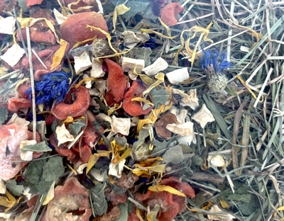 Samenstelling: Hooi, wortels, peterseliewortel, cichoreiwortel, selderie, rozenbottelschillen, berkenblaadjes, bloemkoolbloesems, goudsbloembloesem, aalbesbladeren, gewone sleutelbloem, rozenbloesems (groenten 2,6%, bloesems 0,2%, bladeren 0,2%)