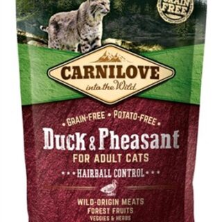 Carnilove Duck/ Pheasant Hairball 2 kg is graanvrij, kwalitatief hoogwaardig volledig voer voor katten met eend en fazant, verrijkt met bietenvezels tegen haarballen. Deze brokken zijn geheel vrij van aardappel en graan, omdat deze ook niet in het natuurlijke dieet van de wilde kat en diens voorouders voorkomt. In plaats daarvan is er gebruik gemaakt van ingrediënten die beter aansluiten bij de voedingsbehoefte van de kat, namelijk een hoog aandeel dierlijke ingrediënten gecombineerd met verse groenten, fruit, kruiden en mineralen. Deze bevatten belangrijke vitaminen en anti-oxidanten, die door de structuur van de gebruikte eiwitten optimaal opgenomen worden door het lichaam. Ook is dit voer verrijkt met bietenvezels die helpen bij het gemakkelijk uitdrijven van haarballen. Het voer is nauwkeurig uitgebalanceerd, makkelijker verteerbaar, holistisch en ook gewoon heel erg lekker.