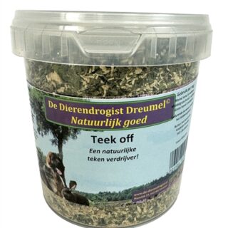 Dierendrogist Teek Off 400 gr is een voedingssupplement voor honden als alternatief voor een chemische (giftige) behandeling voor teken. Dierendrogist Teek Off is een natuurlijk bestrijdingsmiddel tegen teken met kokossnippers, MSM, 10 soorten kruiden, bijenhars en biergist.