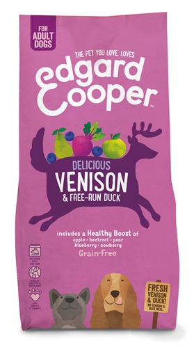 Edgard & Cooper Adult Verse Hert / Scharreleend Graanvrij 7 kg is een smakelijk, volledig droogvoer voor de hond, met verse eend en hert en een gezonde mix van fruit, groenten en kruiden. Een zeer compleet voer voor jouw hond met een heerlijke smaak! Dit voer is gemaakt volgens graanvrij recept met vers vlees, dus zonder gedroogd en gedehydreerd vlees. Het eendenvlees is afkomstig van scharreleenden, en dus gelukkigere, gezondere eenden! Het voer is rijk aan hoogwaardige eiwitten: er is ook zoete aardappel aan toegevoegd als duurzame energieleverancier. Verder bevat deze brok een mix van fruit, groenten en kruiden voor een extra boost. De aanwezigheid van prebiotica zorgt voor een gezonde darmwerking en bovendien is het voer hypoallergeen, dus geschikt voor honden met een gevoelige maag! Deze brokken zijn langzaam gebakken zodat er zoveel mogelijk voedingsstoffen én smaak behouden zijn gebleven.