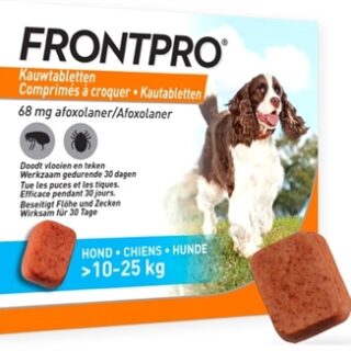De Frontline Frontpro Kauwtabletten S 2-4 kg 3tbl is een lekker en makkelijk kauwtablet die jouw hond 30 dagen beschermt tegen vlooien en teken. Het kauwtablet heeft een heerlijke smaak en is daardoor eenvoudig te geven. Twijfelt jouw hond toch over de kauwtabletten? Dan is het ook in combinatie met ander voedsel te geven.