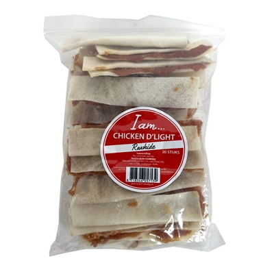 I Am Chicken D'Light Rawhide is een stevige hondensnack gemaakt van kip en runderhuid. Deze kauwsnack is eiwitrijk en heeft een compacte vorm, waardoor hij geschikt is als tussendoortje of beloning.