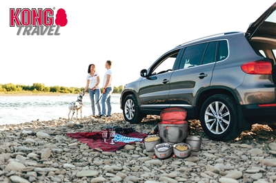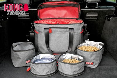 Ga je een lange wandeling maken, camperen, of heb je een lange autorit met de hond voor de boeg? Dan is deze reistas met ideaal! Het meenemen van spullen en drinkbakken is vaak een gedoe, maar met deze handige travelbag van KONG is dat verleden tijd. Deze reistas bevat twee opvouwbare voorraadtassen en twee opvouwbare voer- en drinkbakken. De bakken en tassen zijn gevoerd met een speciaal waterdicht materiaal, zodat je ze kunt gebruiken voor droogvoer, natvoer én water, waar je ook bent. Als de hond klaar is, zijn de bakken en voorraadtassen simpelweg op te vouwen en dicht te ritsen om ruimte te besparen. Eenmaal thuis kun je ze zelfs wassen om ze weer schoon en fris te krijgen! De bakken worden geleverd in een grote reistas met zakken aan de binnen en buitenzijde, zodat je genoeg ruimte hebt ook ook de andere spullen voor jouw hond mee te nemen. De tas heeft een schouderband en handvaten en alles is uitgevoerd in stoere kleuren grijs en zwart met rode KONG-accenten. Zo kun jij vanaf nu altijd voorbereid op pad!