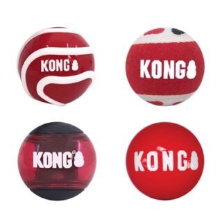 De Kong Signature Ballen 5,5 cm 4 st hondenspeelgoed is een set van vier gekleurde ballen, deze set bevat de Signature bal, Squeezz Action bal, Sport bal en Wavz bal. Houd jouw trouwe viervoeter ook zo van spelen met ballen? Deze set met vier verschillende soorten ballen is dan perfect! Deze set bevat de Signature bal, Squeezz Action bal, Sport bal en Wavz bal. De Signature bal is een stevige bal met twee lagen TPR en pieper voor langdurig speelplezier. De Squeezz Action bal is felgekleurd, heeft verschillende texturen en piept. De Sport bal is steviger en veiliger dan een tennis bal en piept niet. De Wavz bal heeft een aparte vorm.