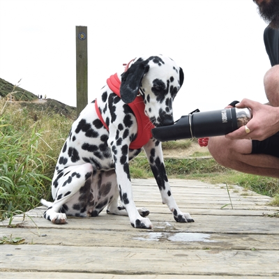 De KONG Trek and Treat combineert slim gemak met stijlvol design voor onderweg. Deze dubbelwandige RVS-fles (295 ml) houdt water koel en beschikt over een handig extra compartiment voor snacks of een kleine maaltijd. Via het geïntegreerde drinkbakje geef je je hond eenvoudig water – overtollig vocht loopt automatisch terug in de fles, zonder verspilling. Ideaal voor wandelingen of dagjes weg met je viervoeter.