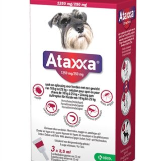 KRKA Ataxxa Spot On Hond 250 mg met 3 pipetten is een vlooienmiddel op basis van permethrine en Imidacloprid dat vlooien, vlooilarven en teken bestrijd bij honden tussen de 10 en 25 kg vanaf 7 weken, en een afwerende werking heeft tegen muggen en zandvliegen. Deze handige spot-on pipetten stellen jou in staat jouw dier eenvoudig te beschermen tegen parasieten. Dit middel werkt op basis van permethrine en imidacloprid, dat vlooien, vlooienlarven en teken bestrijdt, maar ook muggen en zandvliegen afweert om jouw dier nog beter te beschermen. Het middel werkt binnen één dag en de werking houdt vervolgens vier weken aan. Eenvoudig toe te dienen met druppels op de huid van de hond.