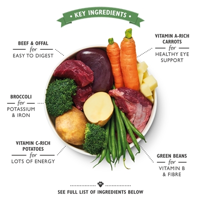 Samenstelling: Vers rundvlees (60%); Aardappelen (3%); Wortelen (3%) Appels, broccoli, groene bonen, vitamines en gechelateerde mineralen, lijnzaad (bron van Omega 3 en 6), Kruiden
