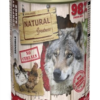 Natural Greatness maakt hoogwaardige, natuurlijke voeding voor de hond. Dit recept maakt gebruik van vers kippenvlees als enige bron van eiwitten. Ideaal als je geen combinatie van eiwitbronnen wilt om allergieën en voedselintoleranties uit te sluiten.