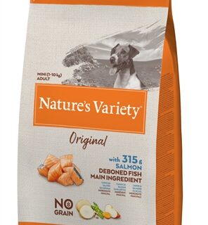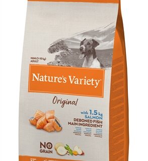 Nature's Variety Original Adult Mini Salmon No Grain 7 kg is een volledig en uitgebalanceerd droogvoer voor honden van mini rassen, met ontbeende zalm als hoofdingrediënt aangevuld met zoete aardappel, fruit en groenten.
