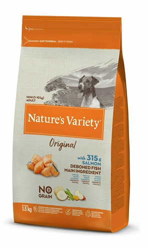 Nature's Variety Original Adult Mini Salmon No Grain 7 kg is een volledig en uitgebalanceerd droogvoer voor honden van mini rassen, met ontbeende zalm als hoofdingrediënt aangevuld met zoete aardappel, fruit en groenten.