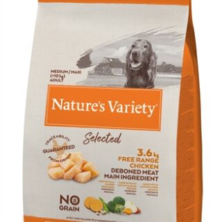Nature's Variety Selected Adult Medium / Maxi Free Range Chicken 12 kg is een volledig en uitgebalanceerd graanvrij droogvoer voor honden van middelgrote en grote rassen, met ontbeende scharrelkip als hoofdingrediënt aangevuld met zoete aardappel, fruit en groenten.