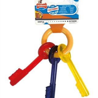 De Nylabone Puppy Chew Bijtsleutels Baconsmaak <16kg is speciaal ontworpen voor puppy's waarbij de tandjes net door beginnen te komen of met melktandjes. De aantrekkelijke bijtring met bacon smaak en sleutels bevordert het kauwen en helpt tandjes gemakkelijker doorkomen. Het zachte maar taaie materiaal is polyurethaan, het harde materiaal is een hoogwaardige 12 uur druk gelouterde nylon. Door deze materialen is dit speeltje geschikt voor pups waarbij de tanden net doorkomen én met een melkgebit. Het ideale speeltje voor pups tot ze gaan wisselen.