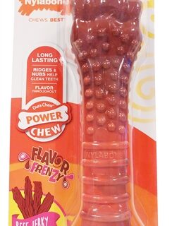Kauwen is een natuurlijke behoefte voor jouw hond. Hiermee houdt de hond zijn gebit gezond en wordt verveling tegengegaan. Stokken kunnen echter versplinteren, met alle gevolgen van dien, en daarom is het zaak jouw hond veilig kauwspeelgoed te geven. Kies daarom voor Nylabone! Nylabone is gemaakt van zeer stevig en veilig kunststof. De randjes en nopjes zorgen er bovendien bij het kauwen voor dat de Nylabone langs de tanden en het tandvlees wrijft en zo het tandvlees masseert en het gebit van vuil en tandplak ontdoet. Dit zorgt voor een gezond gebit en een frisse adem. Om de Nylabone extra aantrekkelijk te maken voor jouw hond, is deze variant voorzien van een heerlijke rund-jerkey smaak. Deze Power Chew-variant is speciaal voor de stevige bijters!