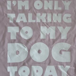 Het T-shirt op de foto heeft de opdruk: “I’M ONLY TALKING TO MY DOG TODAY”