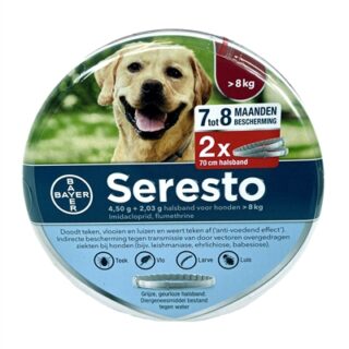 Deze innovatieve halsband beschermt tot 8 maanden tegen vlooien en teken bij honden tot 8 kg. De band heeft een afwerende werking en is geurloos. De werkzaamheid tegen vlooien start onmiddellijk na het aanbrengen van de halsband. De halsband is werkzaam tegen larven, nimfen en volwassen teken en vlooien.