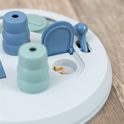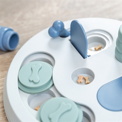 Het Trixie Dog Activity Flip Board 23 cm is een intelligentiespel voor honden met schuifjes waaronder de hond een beloning moet zoeken. Verstop snacks of brokjes achter de schuifjes, onder de pinnen of klepjes. Jouw hond zal de snacks ruiken en verschillende technieken moeten gebruiken om bij het lekkers te komen. Onder de pootjes van het spel zijn antislip waardoor hij niet over de vloer schuift tijdens het zoeken naar lekkers.