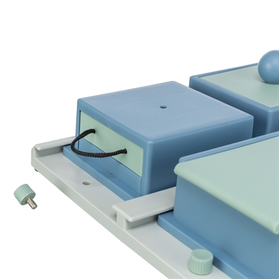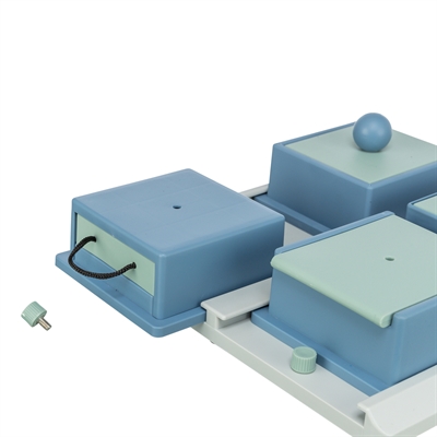 Verstop brokjes of snacks in de vier rode bakjes. De hond zal deze ruiken, maar zal verschillende technieken moeten toepassen om bij de brokjes of snacks te komen. De vier rode bakjes kunnen namelijk ieder op een andere manier geopend worden.
