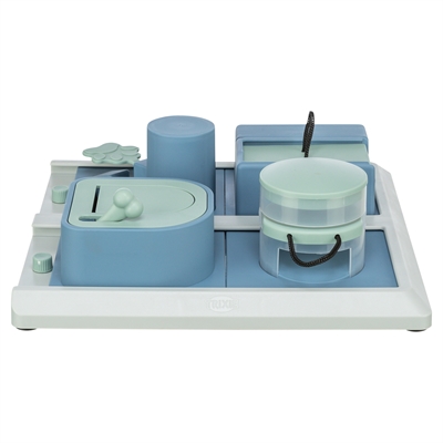 Verberg snacks of brokjes op vijf verschillende manieren bij dit leuke spel voor je hond. Je hond ruikt de snacks of brokjes en zal verschillende technieken moeten toepassen om bij de brokjes of snacks te komen.