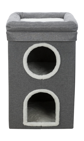 De Trixie Krabpaal Cat Tower Saul Grijs 39 x 39 x 64 cm is een stevige, vierkante krabton voor de kat, met krabvlakken van sisal, schuilplaatsen met gevoerde ligplateaus en afneembare bovenkant. Deze robuuste, stevige krabpaal is een aanwinst voor kat én het interieur. Door zijn vierkante vorm en grijze bekleding met geweven stof is de Saul krabtoren een lust voor het oog. De krabpaal is voorzien van twee interne schuilplaatsen, bekleed met heerlijk zacht pluche en gevoerde lichtplateaus voor meer comfort. Bovenop de krabtoren vindt je een relax-mand van waaruit jouw kat overzicht heeft over de gehele ruimte. Voor goede toegang tot de kat en eenvoudig schoonmaken is de bovenzijde van de krabpaal afneembaar. Aan de grote sisal krabvlakken kan jouw kat zijn naar hartenlust krabben: dit voorkomt schade aan behang en meubilair, daar krabben een natuurlijke behoefte voor katten is.