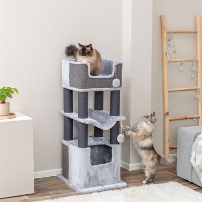 De Trixie Krabpaal Lucano XXL Lichtgrijs/Donkergrijs is een robuuste en comfortabele krabpaal, speciaal ontworpen voor grote katten. De stevige jute krabpalen en zachte pluche bekleding bieden de perfecte combinatie van speelplezier en ontspanning. De paal beschikt over meerdere niveaus, een ruime schuilplaats met zachte bekleding en twee omkeerbare kussens voor extra comfort. Bovenop bevindt zich een verhoogd ligmandje waar je kat heerlijk kan rusten of de omgeving kan overzien.