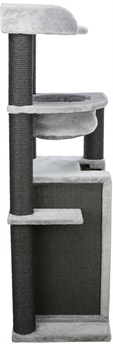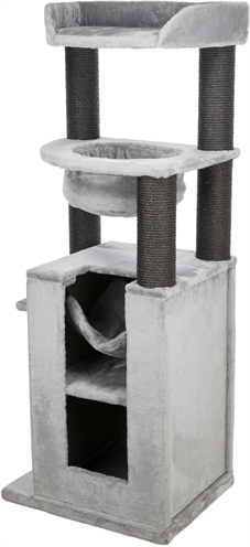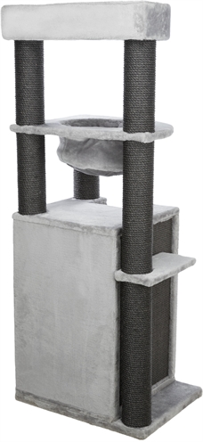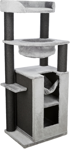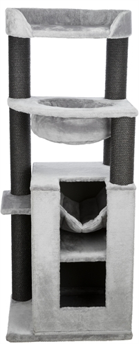 De Trixie Krabpaal XXL Leandro Grijs 63 x 50 x 163 cm is een extra groot krabmeubel voor grote kattenrassen, met schuilplaatsen, relax-slaapzak, hangmat en ligplateau. Wil jij jouw katten de ultieme luxe bieden? Kies dan voor dit uitgebreide krabmeubel van Trixie! Krabpaal XXL Leandro is een zeer uitgebreid krabmeubel dat ook geschikt is voor grotere kattenrassen. Het zeer complete krabmeubel bestaat uit onder andere meerdere krabstammen bekleed met sisal, een schuilplaats binnenin bekleed met pluche en een ligplateau met een mand met gevoerde rand. Ook kan jouw kat heerlijk luieren in de stevige, gevoerde relax-slaapzak en de afneembare hangmat in de schuilplaats. Voor extra krabplezier is de zijkant van de toren ook nog voorzien van een groot sisal-krabvlak. Uitgerust met een dikke, massieve bodemplaat voor meer stevigheid, die zorgt dat de krabpaal stevig blijft staan ook als grote katten als Maine Coons en boskatten op de krabpaal springen.
