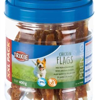De Trixie Premio Chicken Flags 22 gr zijn smakelijke kauwsnacks voor de hond van runderhuid met kippenborst. Deze kauwrollen van Trixie zijn gemaakt van rolletjes runderhuid die bekleed zijn met smakelijke kippenborst. Heerlijk om lekker van te smullen en daarna op te kluiven! De runderhuid wordt zacht wanneer er op gekauwd wordt en zorgt door de wrijving langs de tanden voor vermindering van tandsteen en verzorging van het gebit. Bovendien bevatten deze lekkere Premio Flags veel proteïnen en zijn zij rijk aan vlees, met een vleesgehalte van maar liefst 65%. Een gezonde snack voor jouw hond die verveling tegengaat!