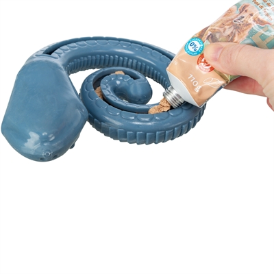 Met deze leuke Snack-slang van Trixie ga je verveling tegen door jouw hond spelenderwijs te belonen. Deze vrolijke snack-slang is gemaakt van thermoplastisch rubber en is open aan de onderzijde. In deze spleetvormige opening kun je verschillende soorten voer of snacks stoppen, zodat de hond spelenderwijs bezig is zijn beloning te krijgen. Door de smalle opening is de slang ook geschikt voor bijvoorbeeld leverworst: de hond is lang bezig alle paté uit de opening te likken. Zo blijft jouw hond lekker bezig, ook als jij er niet bent, en ga je verveling tegen.