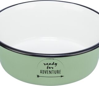 De Trixie Voerbak Emaille / RVS Groen 21 cm 1,9ltr is een stijlvolle voerbak of drinkbak voor de kat of hond, gemaakt van emaille. Deze leuke voerbak is gemaakt van emaille en voorzien van een leuke opdruk aan de voorkant, ‘Ready for adventure’. Deze bak is geschikt voor natvoer, droogvoer en water. Vaatwasserbestendig en met rubberen, slipvaste voetjes!