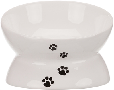 De Trixie Voerbak Kat Wit 150 ml 13 cm is een ergonomische, keramische voerbak of waterbak voor de kat. Deze bak staat verhoog, op een soort voetstuk, waardoor de kat minder ver door de poten hoeft te zakken om te eten. Dit komt de gewrichten en spijsvertering ten goede. De bak is gemaakt van keramiek en daardoor niet alleen makkelijk af te nemen, maar ook te gebruiken voor water of natvoer. De voerbak is wit met een leuke opdruk van zwarte pootafdrukjes.
