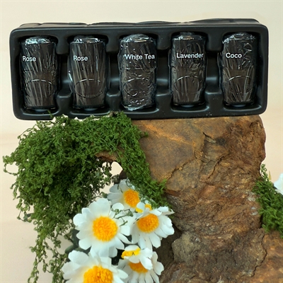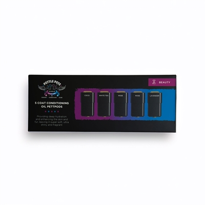 Een doosje met 5 vacht-verzorgende olie-capsules (pods) voor de Vapor Mist Brush. De volgende 4 geuren zitten in het doosje: